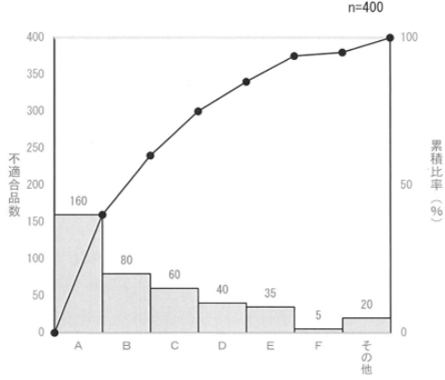 パレート図は、問題の発生原因ごとに件数(または割合)を並べ、累積比率を折れ線グラフで示した図で、「重要な少数(パレートの法則:80対20の法則)」に着目し、優先的に改善すべき項目を特定するのに役立ちます。