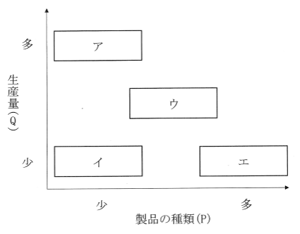 領域「ア」は、製品の種類が極めて少なく(P少)、特定の品目の生産量が圧倒的に多い(Q多)「少種多量生産」の領域です。